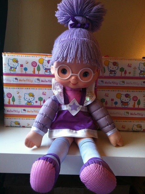 Shy Violet (or just Violet) was Rainbow Brite’s quieter, bookish friend. She was a thinker, trying to solve problems by working them out in her mind before acting. She was also dressed in head-to-toe purple, which gained her a lot of points in my book. I wanted to be Violet. My Violet doll was one of my favorite possessions. I remember this doll being enormous but it’s probably not much bigger than a medium teddy bear - I just have a hard time remembering myself as being that small, I think.